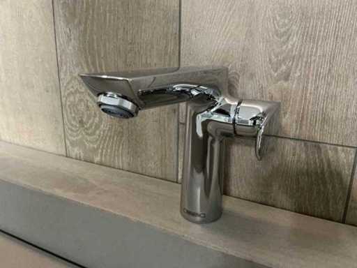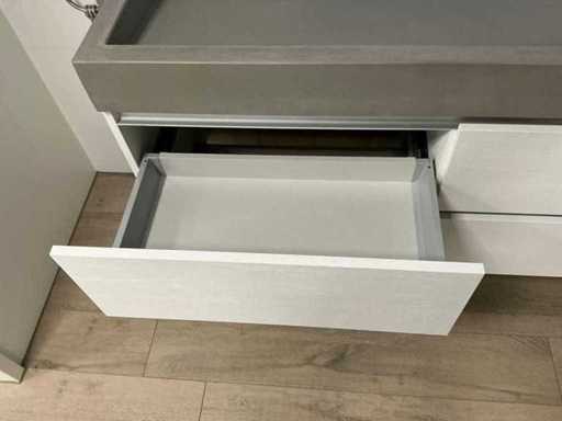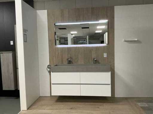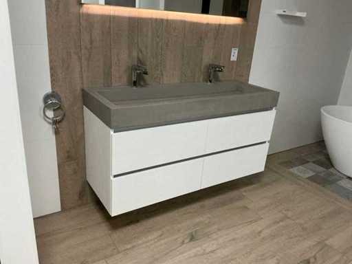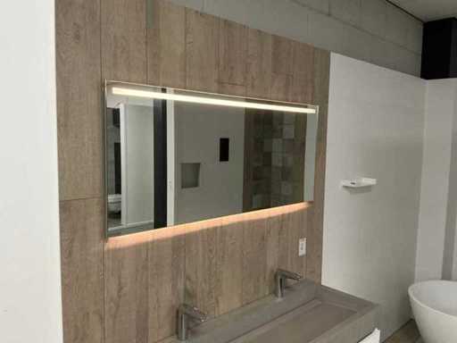 Ausgestattet mit einem Evolve Duo Waschbecken (140x50cm), 2x Hansgrohe Focus Armatur und LED-Spiegel mit Dimmer, Farbwechsel und Spiegelheizung (140x60cm) sowie einem maßgefertigten Bodenschrank (140x55cm).