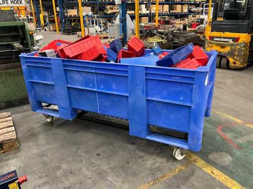 Gefüllt mit Plastikbehältern auf einem mobilen Stahlrahmen