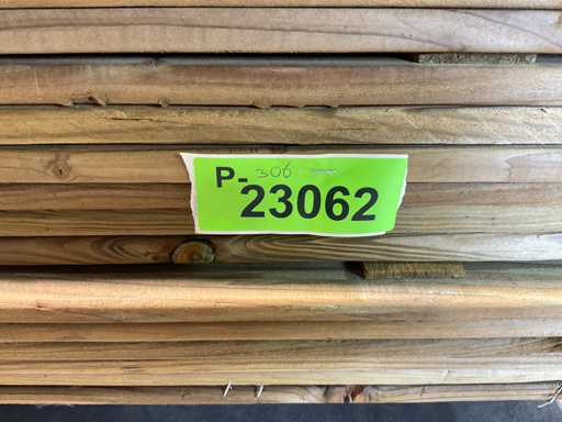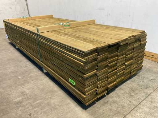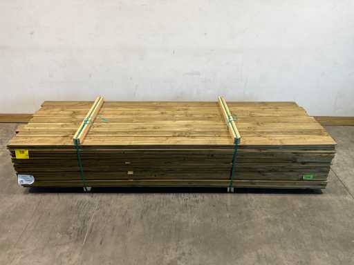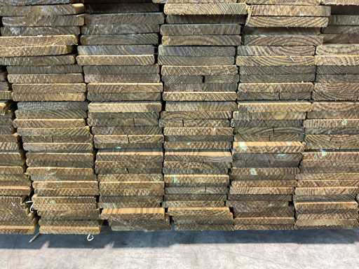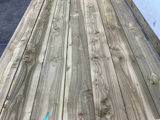 Douglasie gehobelte Bretter, mit einer Größe von je 300 x 14 x 1,6 cm. Die Dielen sind grün imprägniert.