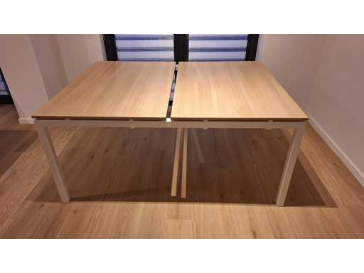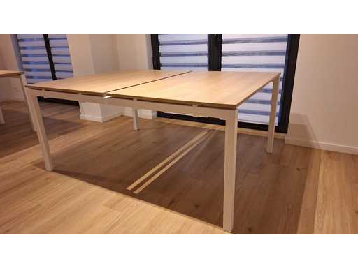 Sockel in Metallfarbe Weiß, Oberseiten in Melamin-Licht Eiche mit Kabelklemmen, sehr guter Zustand