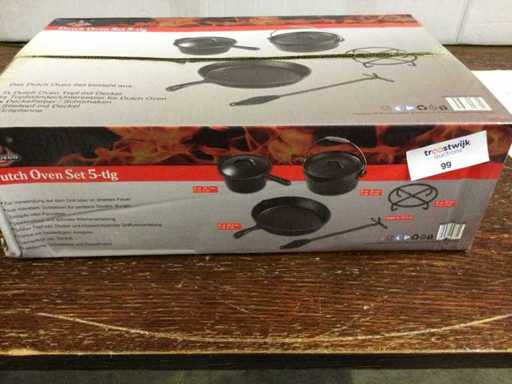 Ein 5-teiliges Dutch Oven Set besteht aus: - Gusseisenauflauf mit Deckel Ø 24 x 10 cm - Gusseisenpfanne Ø 30,5 cm x 9 cm - Gusseisentopf mit Deckel Ø 18,7 cm x 9 cm - Eisenachterbahn für mehr Bodenfreiheit Ø 20 x 5 cm - Schalthebel / Hebehilfe, Länge ca. 42,5 cm - Robustes massives Gusseisendesign - 3 Fuß für einen Stallstand - Beinhaltet Deckelheber und Transportgriff Technische Spezifikationen Gewicht: 11,6 kg Höhe: 15,5 cm Breite: 49,5 cm Tiefe: 31,5 cm