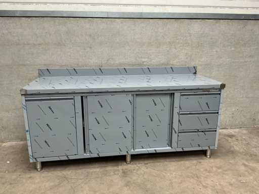 Edelstahl-Arbeitstisch mit erhöhter Kante, 3 Schubladen, 2 Schiebetüren, Tür für den Mülleimer und 1 höhenverstellbares Regal