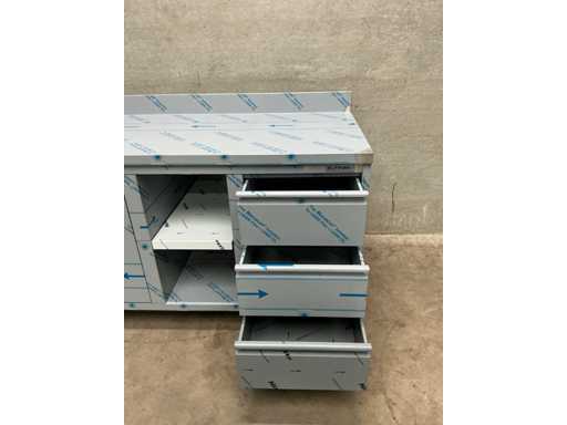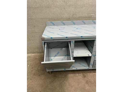 Edelstahl-Arbeitstisch mit erhöhter Kante, 3 Schubladen, 1 Tür für den Mülleimer und 1 höhenverstellbares Regal