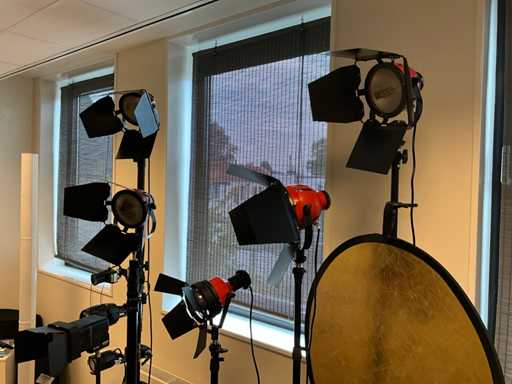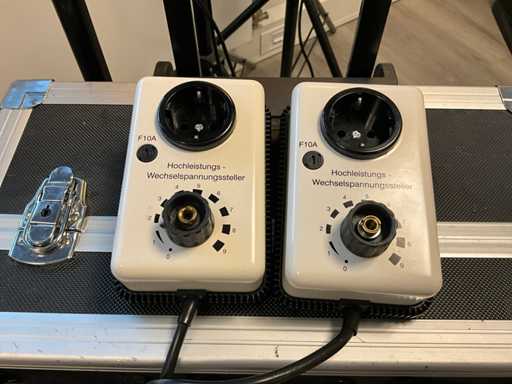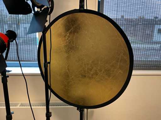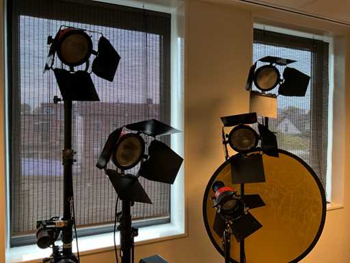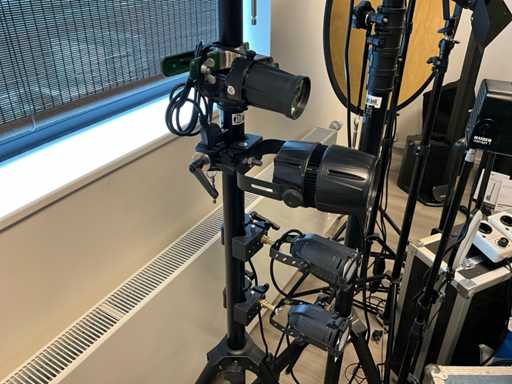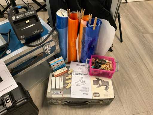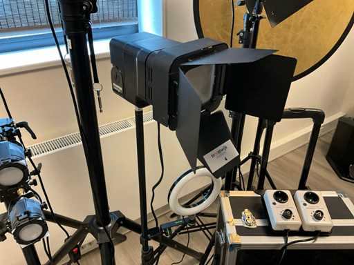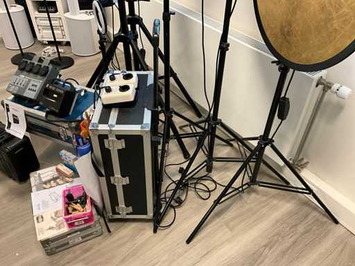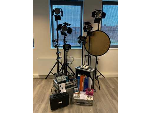 Bestehend aus 2 "Adam Hall" Schwerlaststativen; 4 zusammenklappbare Lichtstative; 3 Superklemmen; und 3 Marktklemmen; Reflexionsschirm; 5 Rotköpfe davon 4x 800W und 1x Pin-Spot 650W; "Kaiser" Videoleuchte 1 1000W, 4 verschiedene Pin-Spots; 1 Ring-LED; 2 Handdimmer "FG-ELEKTRONIK" NS 2003; "RVE" Mini Cube 1-Kanal-Handdimmer; "Showtec" 4-Kanal-Multidim; Korrekturfilter; Stöpsel; Ersatzlichtquellen; 2 Koffer-Flightcases; 1 Dolly Flightcase und 1 Hartschalenkoffer