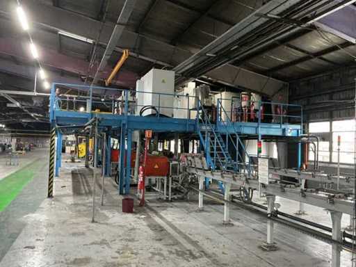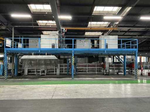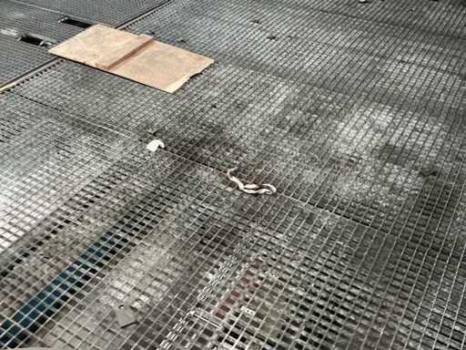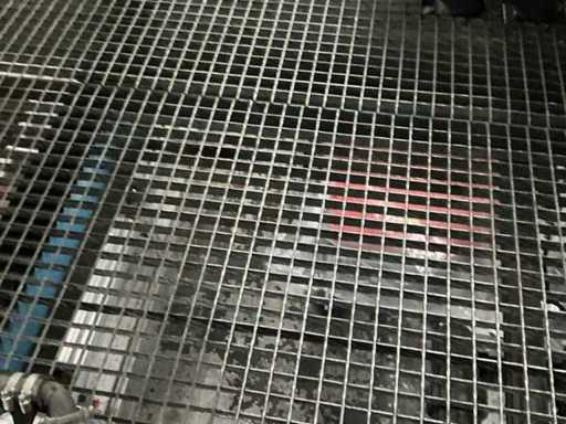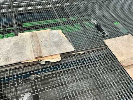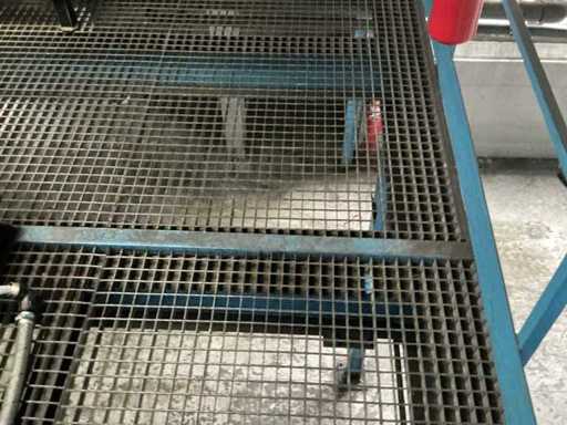 Erhöhte Metallplattform mit verzinktem Gitterboden, Geländern und 12-stufigen Zugangstreppen.
