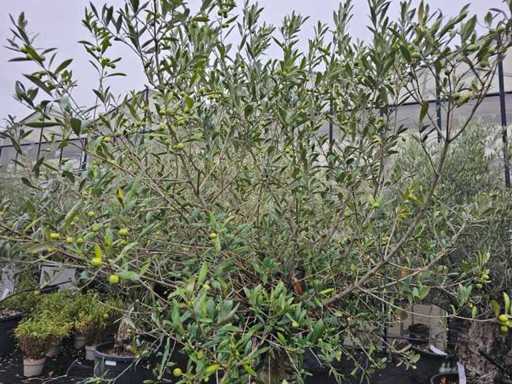 Bring Mediterranean flair to your outdoor space with this magnificent olive tree, approximately 80-100 years old. This specimen impresses with its striking, sturdy trunk and a beautifully formed crown with silvery-green foliage. This botanical treasure is delivered in a high-quality black designer pot with a gold emblem, which perfectly underlines the elegance of the tree. Thanks to its hardiness down to -12°C, it is ideally suited for protected outdoor locations.