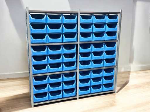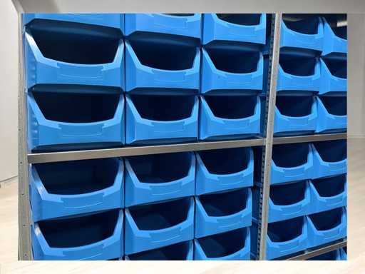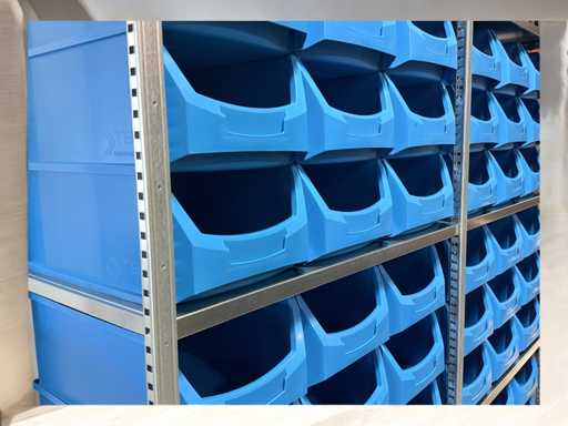 Fachbodenregale inkl. 54 blaue Lagerkästen. Saubere und unbenutzte Behälter
