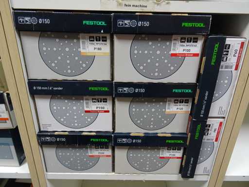 18 Packungen Festool-Sandpapier, die meisten davon geöffnete Verpackungen.