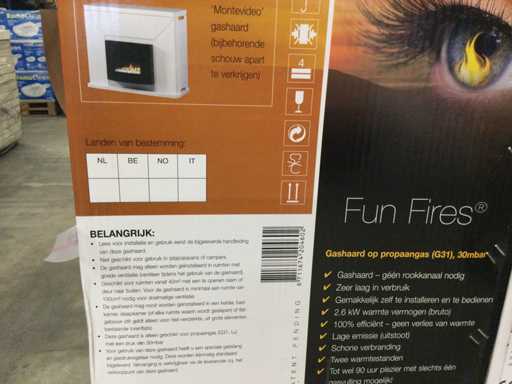 Das Set besteht aus 2 Boxen. Also insgesamt 8 Boxen. Die Box-Konvertierung ist umfangreich und groß. (133x103 cm). Die Produktlinie Fleem bietet ein gemütliches Feuer, das sowohl dem Innenraum als auch dem Garten oder der Terrasse eine warme, lebendige Atmosphäre verleiht. Fleem bietet Produkte für jede Jahreszeit. Wählen Sie einen gemütlichen, warmen Stil oder ein modernes, schlankes Design. Sicherheit ist von größter Bedeutung und deshalb garantieren wir, dass die Kamine den neuesten Sicherheitsvorschriften entsprechen. Der Fleem Gaskamin Montevideo ist ein Gaskamin auf einer Gasflasche, also der Vorteil eines echten Flammenspiels, aber nicht die Belastung durch den Anschluss an eine feste Installation. Diese Gasflasche ist nicht im Lieferumfang enthalten, benötigt Propangas, Gas mit einem Druck von 30mB (G-31). Der Kamin verfügt über 2 Heizstufen mit hoher Leistung von 2,6 kW und niedriger Leistung von 1,6 kW