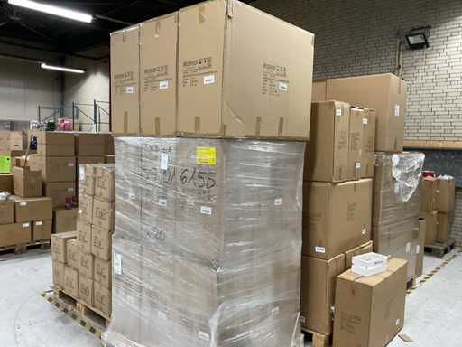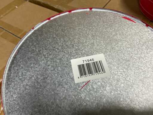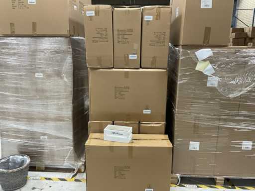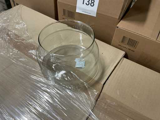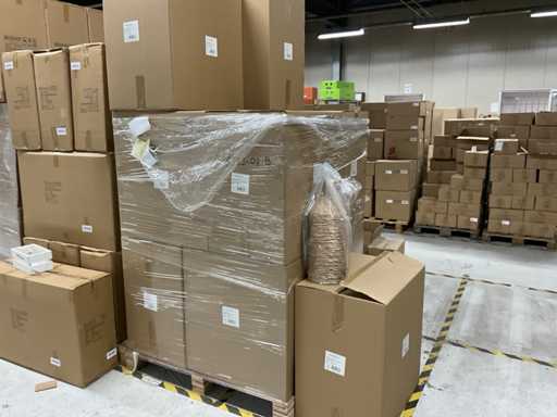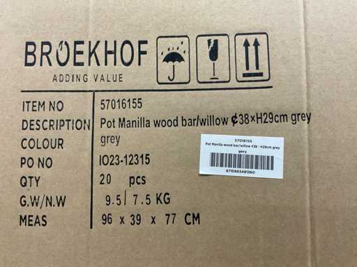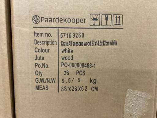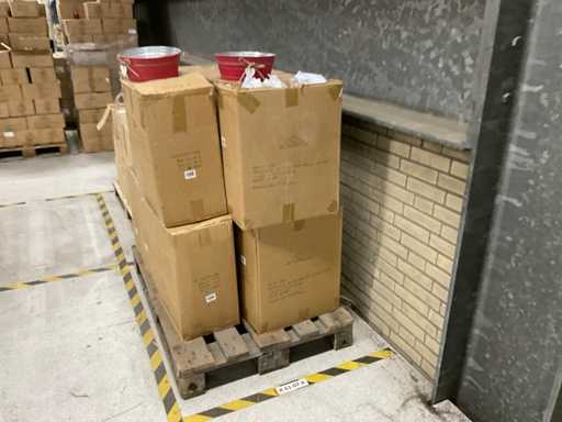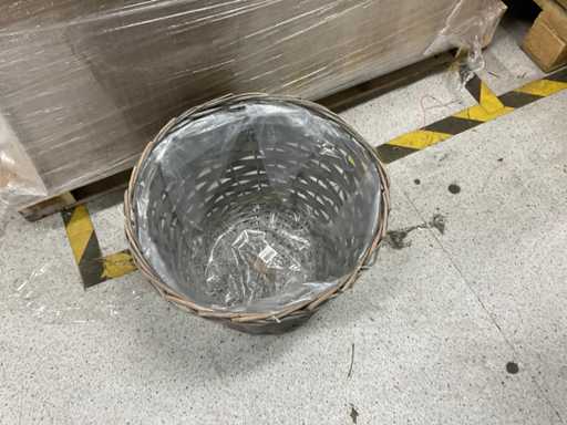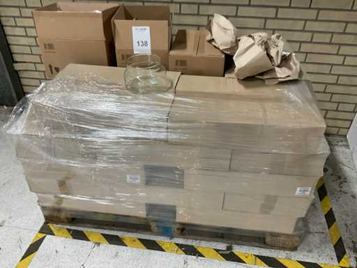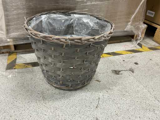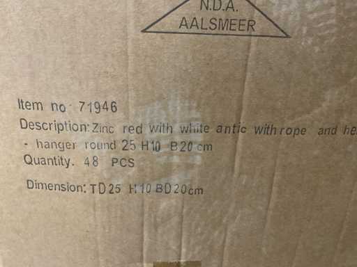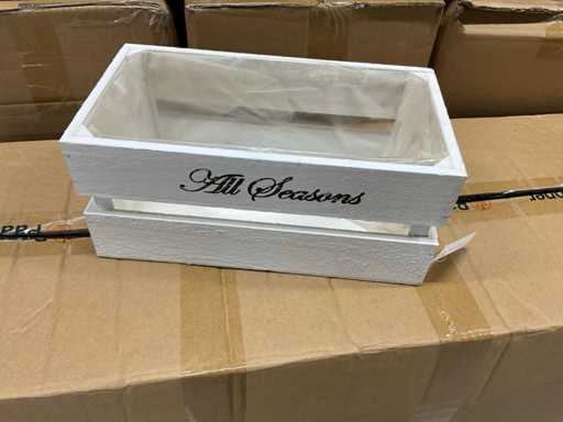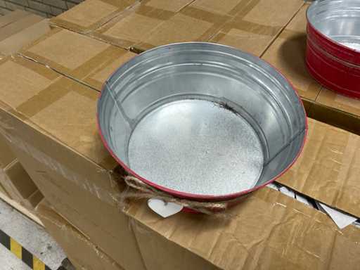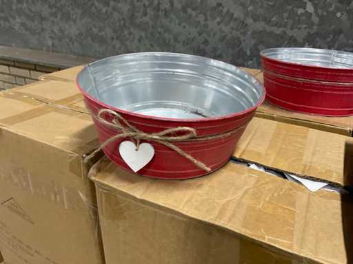 5 Paletten mit Dekorationsartikeln bestehend aus Gläsern, Durchmesser ca. 16 cm, Höhe ca. 9,5 cm, rote Zinkschalen, Durchmesser ca. 25 cm, Höhe ca. 10 cm, Blumenstraußhalter Durchmesser ca. 20 cm, Pflanzgefäß aus Holz, ca. 27x14x12 cm, weiß 'All Seasons', Körbe, Durchmesser ca. 38 cm, Höhe ca. 29 cm, inkl. Paletten.