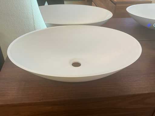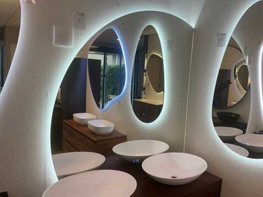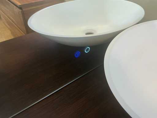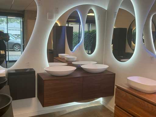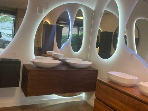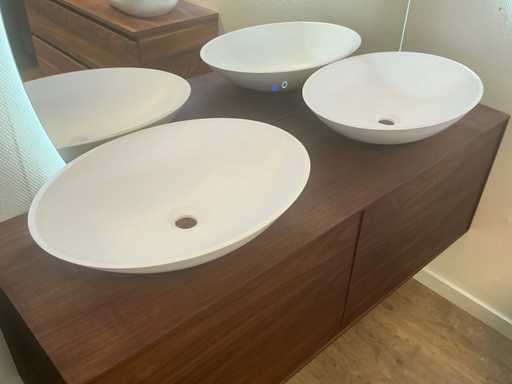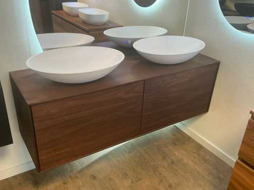 Besteht; 1x Unterschrank 120x45cm; 2x Waschbecken aus gegossenem Marmor 42x30cm cm; 1x Badezimmerspiegel ausgestattet mit Beleuchtung (dimmbar) und Heizspiegel 120x120cm