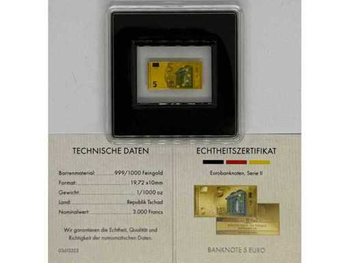 Gold 999 (1/500 oz) – „Eurobanknoten Serie II“ 5 Euro – Tschad 3000 CFA Goldmünzenbarren
