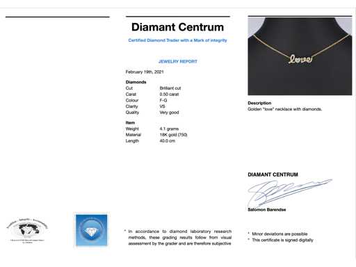 De winkelwaarde die bij de sieraden en diamanten vermeld staat is de historische retailprijs. Dit is de prijs waarvoor het sieraad in het verleden of in sommige gevallen nog steeds bij de juwelier in de etalage heeft gelegen/ligt. De waardebepaling is een beoordeling van een gecertificeerde diamantair en lid van de Beurs voor den Diamanthandel te Amsterdam.