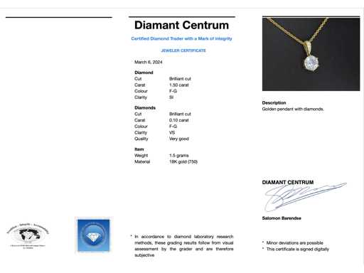 Diamant: Natürlich; Menge: 1 Stück; Schnitt: Brillantschnitt; Gewicht (Karat): 1,50 Karat; Farbe: F-G; Reinheit: SI; Schnittqualität: sehr schön; Diamant (Sekundärspieler): Diamanten; Anzahl der Karo: 5 Figuren; Schnitt: Brillantschnitt; Gewicht (Karat): 0,10 Karat; Farbe: F-G; Reinheit: USA; Schnittqualität: Sehr schön; Juwel: Anhänger (ausgenommen Halskette); Gewicht: 1,5 Unzen; Maße/Länge: 1,6 x 0,8 cm; Material: 18 Karat Gold (750); Zustand: Neu; Verpackung: Luxus-Schmuckschatulle; Erklärung: Die Qualität wurde aus dem Bericht übernommen, der zum Artikel gehört. Die Bewertung ist eine Bewertung eines zertifizierten Diamanthändlers, basierend auf Verbraucherpreisen; Verbraucherpreis: 22.800 €