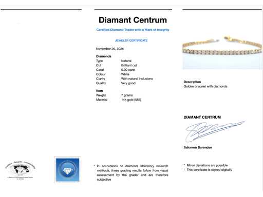 Diamant: Natürlich; Menge: 57 Stück; Schnitt: Brillantschnitt; Gewicht (Karat): 5,00 Karat; Farbe: Weiß; Reinheit: Mit natürlichen Einschlüssen; Schnittqualität: Sehr schön; Juwel: Armband; Gewicht: 7 Gramm; Abmessungen/Länge: 17 cm; Material: 14 Karat Gold (585); Zustand: Neu; Verpackung: Luxus-Schmuckschatulle; Erklärung: Die Qualität wurde aus dem Bericht übernommen, der zum Artikel gehört. Die Bewertung ist eine Bewertung eines zertifizierten Diamanthändlers, basierend auf Verbraucherpreisen; Verbraucherpreis: 11.660 €