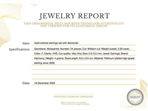 Edelstein: Moissanit; Stückzahl: 24 Stück; Schnitt: Brillantschnitt; Gewicht (Karat): 2,00 Karat; Farbe: F; Reinheit: VVS; Schnittqualität: Sehr schön; Abmessungen: 2,0–3,5 mm; Juwel: Ohrringe; Marke: Harmony; Gewicht: 4 Gramm; Material: Platin-Qualität hochwertiges Sterlingsilber (925); Zustand: Neu; Verpackung: Schmuckschatulle oder Samtetui; Erklärung: Die Qualität wurde aus dem Bericht übernommen, der zum Artikel gehört. Die Bewertung ist eine Bewertung eines zertifizierten Diamanthändlers, basierend auf Verbraucherpreisen; Zusätzliche Informationen: Das gemessene Gewicht der Edelsteine richtet sich nach Diamantgrößen ab; Verbraucherpreis: 1.400 €