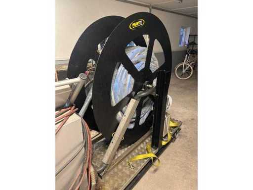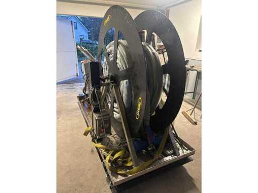 Komplettes Graco Reactor E-XP2 Heißspray-Set Für Polyurea-Anwendungen. Beinhaltet Speisepumpen, Spritzen und eine elektrisch betriebene Spule. Das Ganze ist auf einem mobilen Rahmen montiert.