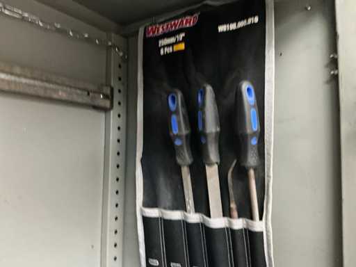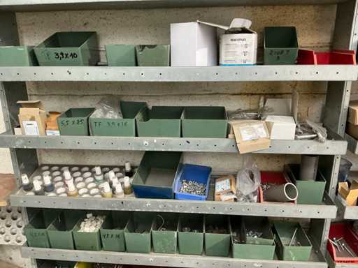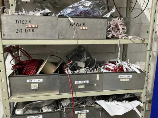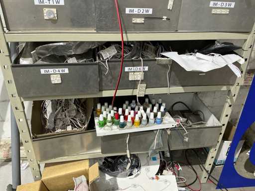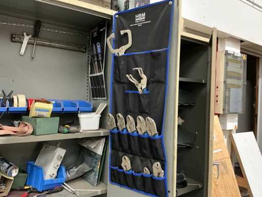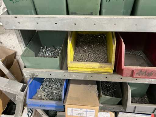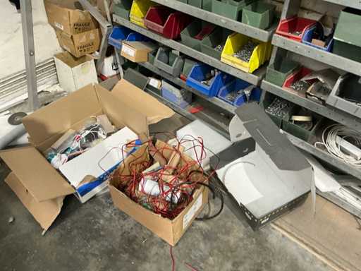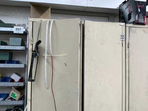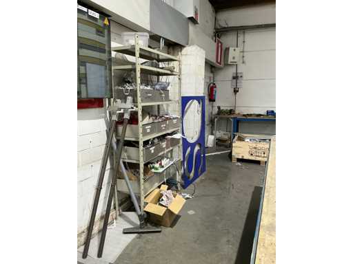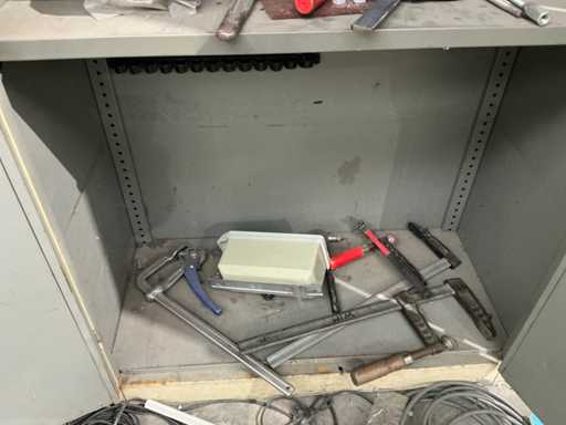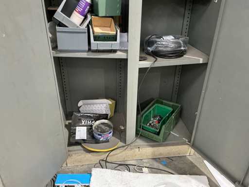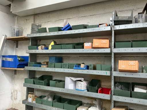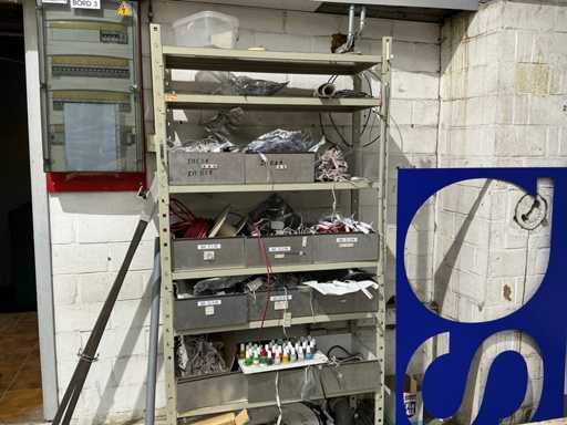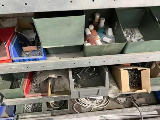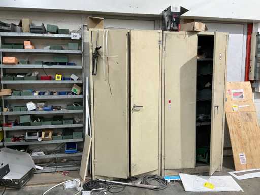 Einschließlich einer Charge von Schrauben, Muttern, Schrauben, verschiedenen Handwerkzeugen, Klemmen, Klebeband, einer Charge verschiedener elektrischer Zubehörteile, komplett mit jeweils 2 Metallschränken von ca. 92 x 43 x 195 cm und 2 Metallaufbewahrungsregale, darunter eines von ca. 105 x 37 x 200 cm