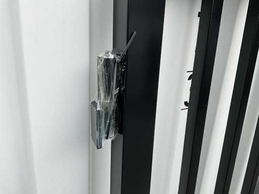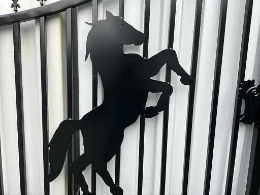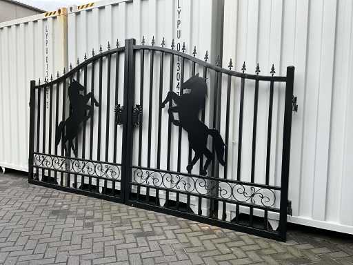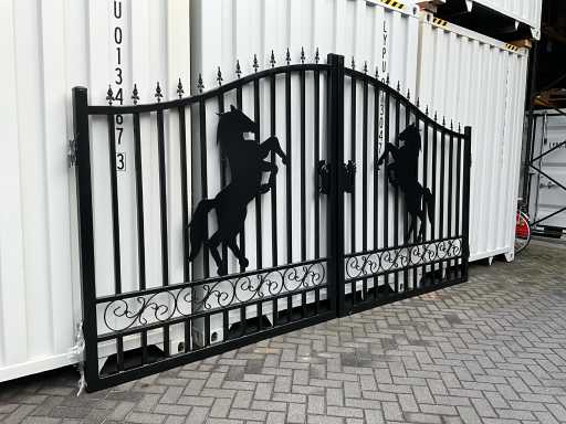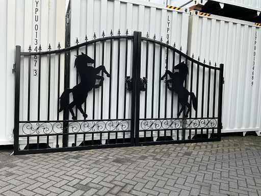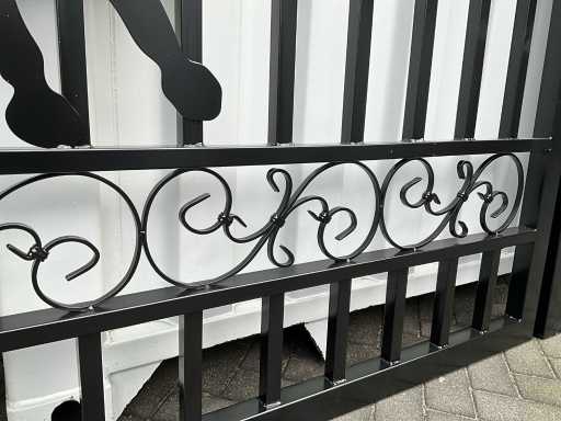 Tor aus Stahl, schwarze Beschichtung, 422 cm breit, Höhe; von 180 cm bis 230 cm (außen nach innen), Außenrahmen 50 x 50 mm, Stangen 25 x 25 mm, Schweißscharnier, ungenutzt