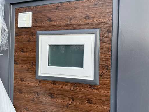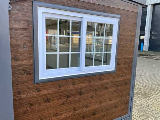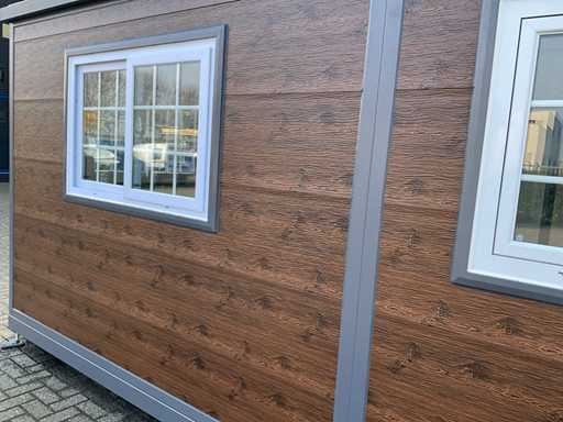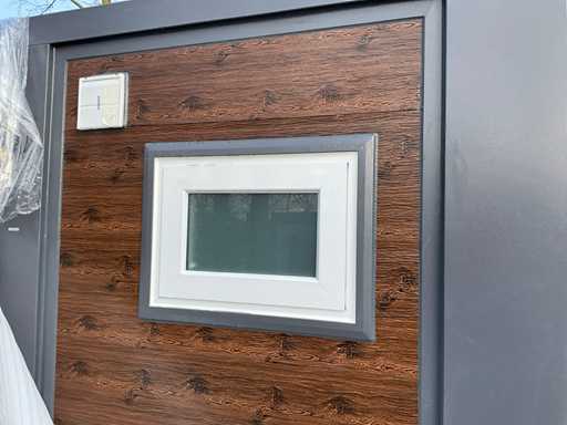 SIEHE FOTO 2, 38, 39 UND 40 FÜR DIE KORREKTE AUSSENFARBE. Ausgestattet mit isoliertem Dach und Wänden, Küche mit Schränken unten und oben, Badezimmer mit großer Dusche, Waschbecken mit Spiegelschrank, WC, Fischgrät-Vinylboden, Ventilator, 2 Schlafzimmer, jedes Zimmer mit Steckdosen und Beleuchtung, Kunststoffrahmen mit Doppelverglasung, alle Türen mit Schlössern, voll abschließbar, alle Anschlüsse für Abwasser, Wasser- und Entwässerung und Strom anschlussbereit, Außen mit Kunststoff-Holzoptik-Paneelen, Transportmaß 5850x2200x 2550 mm, unbenutzt Baujahr 2025