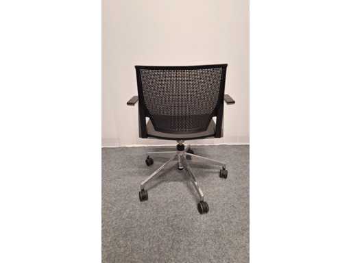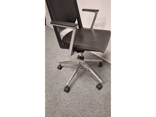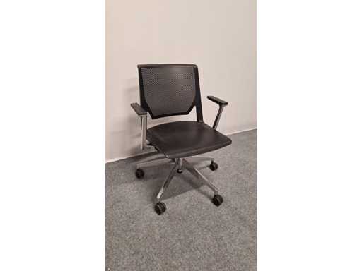 Sockel aus poliertem Aluminium mit multifunktionalen Drehrädern, Armlehnen aus poliertem Aluminium mit Kunststoffregalen in Schwarz, Sitz und Rückenlehne in Kunststoff Schwarz, wunderschöner Design-Konferenztischstuhl aus hochwertigen Materialien, Abnutzungsspuren sind sichtbar