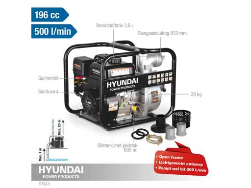 • Diese selbstprimierende Zentrifugalpumpe des Hyundai ist mit einem leistungsstarken 196-ccm-OHV-Benzinmotor ausgestattet. Die Maschine eignet sich sowohl für private als auch für den gewerblichen Gebrauch, zum Beispiel für ein Schwimmbecken, ein landwirtschaftliches Land/Garten oder auf der Baustelle. Teilweise aufgrund der Größe (50 mm (2'') von Ein- und Auslass liefert die Maschine eine beeindruckende und zuverlässige Pumpleistung mit einer Durchflussrate von 500 Litern pro Minute. • Diese Wasserpumpe ist nicht für den Einsatz mit Meerwasser oder anderem mit Chemikalien vermischtem Wasser geeignet, da dies die inneren Teile beschädigen kann. Allerdings können Teile mit einem Durchmesser von bis zu 7 mm ins Wasser gepumpt werden, wobei die Maschine eine Saughöhe von 7 Metern sowie einen Gesamtförderkopf von 23 Metern bietet. • Mit einem Gewicht von nur 29 kg handelt es sich um eine leichte Wasserpumpe. Leicht zu transportieren und zu lagern. Der robuste, offene Rahmen schützt die Pumpe vor Stößen und Stoßen und dient zudem als Griff, um die Wasserpumpe zu bewegen. - Leichtgewicht: nur 29 Gramm - Kompakte Bauweise mit offenem Rahmen - Pumpt beeindruckende 500 Liter pro Minute - Saughöhe von mindestens 7 Metern und Förderhöhe von bis zu 23 Metern - Motorgröße: 196 ccm (Typ LS 196) EURO5 - Kraftstofftankkapazität: 3,6 Liter - Kraftstofftyp: Benzin - Euro 98 (E5) - Kraftstoffverbrauch: 380 g/kWh - Im kontinuierlichen Einsatz: 1,8 Stunden - Öltankfassung: 0,6 Liter - Öltyp: SAE 10W-30 - Maximale Leistung @ 3600 U/min: (PS / kW) 6,5 / 4,85 - Laufwerkstyp: Direktantrieb - Startmethode: Zug-Start-Kabel - Einlass (Zoll/mm): 2" / 50 mm - Output (Zoll/mm): 2" / 50 mm - Schalldruck LpA: 103 dB(A) - Maximale Durchflussrate: 500 (Liter/Minute) - Pumpengehäusematerial: Aluminium - Gesamtkopf: 23 m - Saughöhe: 7 Meter - Betriebsmaße: 480 x 380 x 420 mm (LxWxH) - Einsatzgewicht: 29 Kilogramm - : Was in der Box ist: - Hyundai 196cc Sauberwasserpumpe 50 mm -Benutzerhandbuch