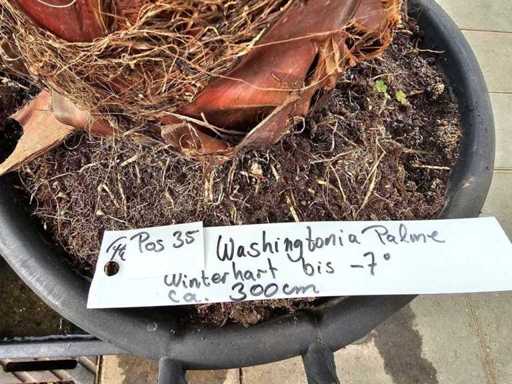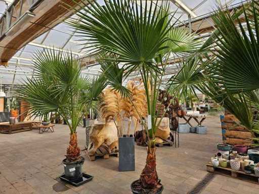 Bring a touch of the Mediterranean to your garden with this impressive Washingtonia palm. Standing at approximately 300 cm tall with its characteristic fan-shaped leaves, it is a true eye-catcher for any outdoor space. This variety is robust and briefly hardy down to -7°C, making it ideal for protected outdoor locations or as a container plant for spacious terraces. A strong trunk and vital green foliage demonstrate its premium quality.