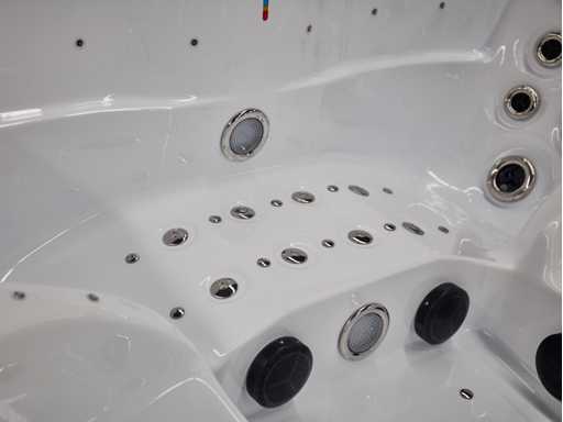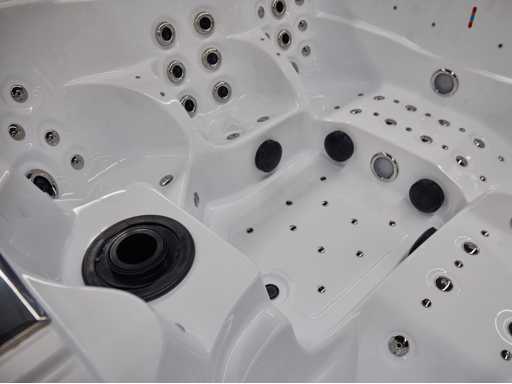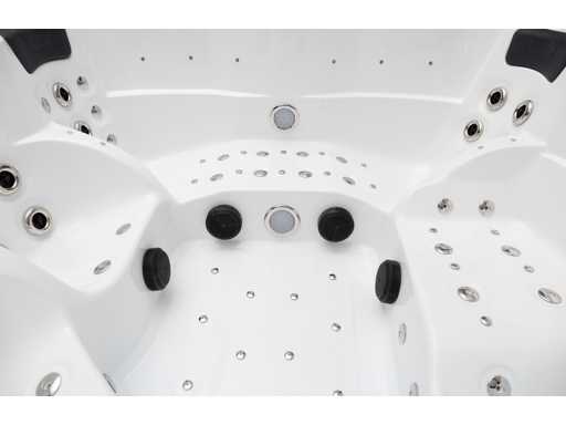 Typ: HT2021-2BED-WHNA. Modell: Freistehend Anzahl Personen: 5 Personen: 3 Kojen, 2 Sitze Rahmen Edelstahl Düsen: Insgesamt 91 Düsen, davon 66 Wasserdüsen verschiedener Größen und 25 Luftdüsen. Alle Rückenlehnen sind mit Wasserstrahlen ausgestattet, einschließlich rotierender Düsen. Heizung: 3 kW Heizung zur Wassertemperatur Ausgestattet mit: Schwarzer Abdeckung (kostenlos enthalten) - Radio - 2 Lautsprecher - Bluetooth - Isolierung - 4 Kissen - Ozondesinfektion - Anschlüsse sind frei zugänglich und die Motoren arbeiten mit 220V (umwandelbar auf 380V). Garantie: 1 Jahr