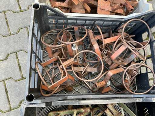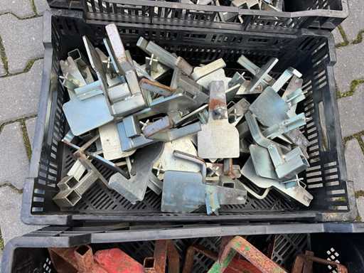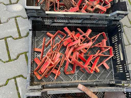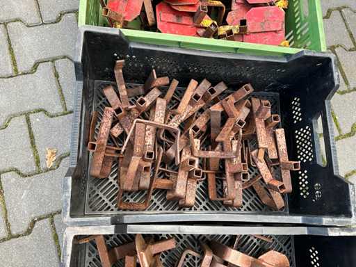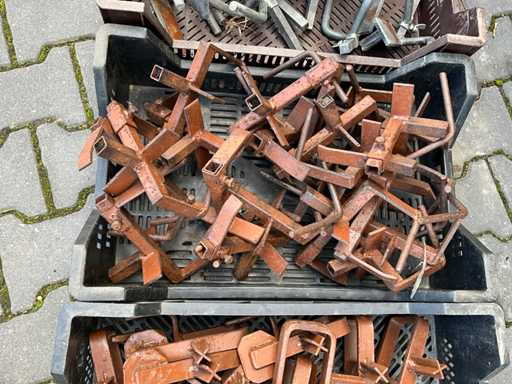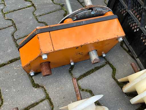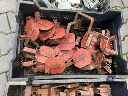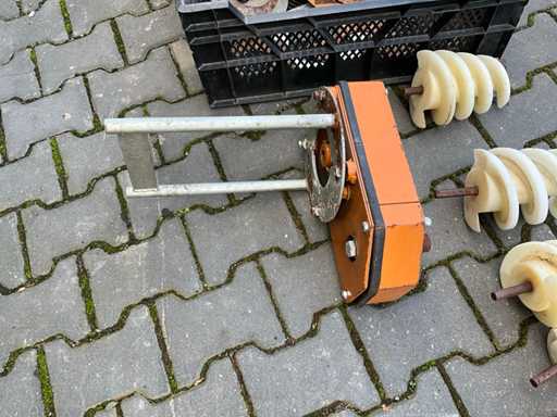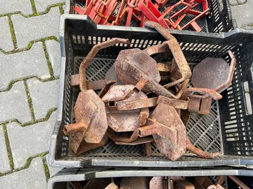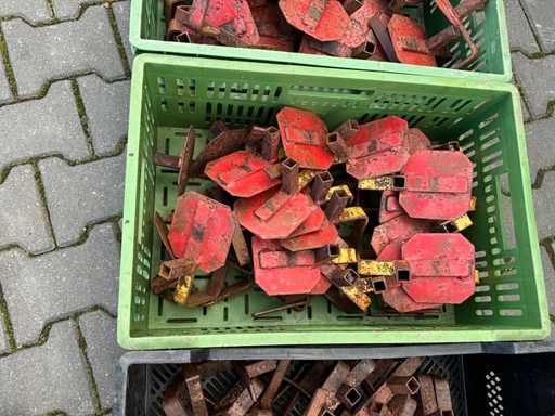Verschiedene Topflappen für JAVO Topfmaschine, sortiert nach Größe, Größen:8; 7; 16,5; 15; 16; 11 verstellbar; 17; 9; 14; 23; 11; 12; 13; 14; 24; 16; 10; 11; 15; 9,5; 15,5; 12; 10,5; 12,5; 12, inkl. Kisten, diverse Schnecken (Größen 3,5; 4; 3; 5; 13; 13,5; 14; 15), diverse Druckplatten, Doppelbohrkopf