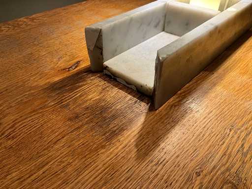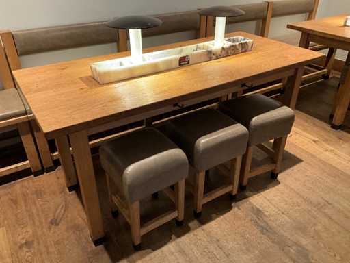 Set aus 2 halbhohen Tischen mit Marmoraufbau und Beleuchtung (Maße 125x80x87 und 180x80x87 cm), 2 Bänken (am Boden befestigt) (Maße 240x50x96 cm, Sitzhöhe 57 cm) und 5 Hockern (Maße 37x27x57 cm). Der Tisch ist bereits vom Boden und dem Strom getrennt. Dafür fallen zusätzliche Kosten an. Der Käufer ist für die professionelle Demontage des Grundstücks verantwortlich. Wir empfehlen Ihnen, den Vorstellungstag zu nutzen, um einen Abbauplan zu erstellen. Schäden am Eigentum oder an anderen Gegenständen werden vom Käufer übernommen.