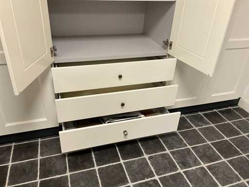 Ohne Inhalt. Bitte beachten Sie! Der Schrank ist zusammengebaut und besteht aus 3 Kabinettteilen.