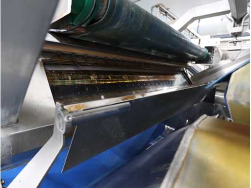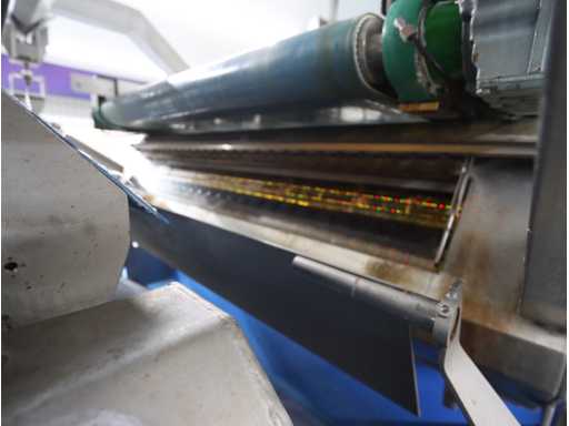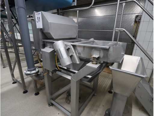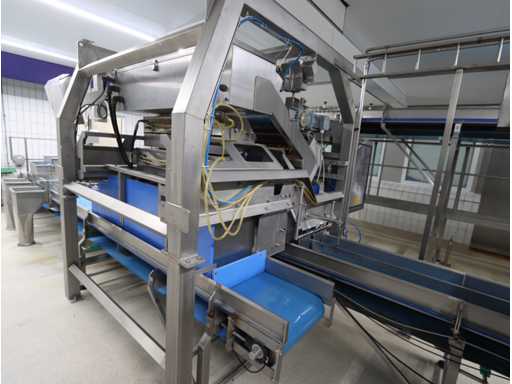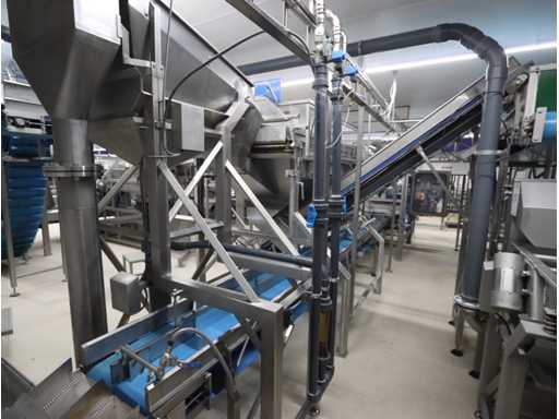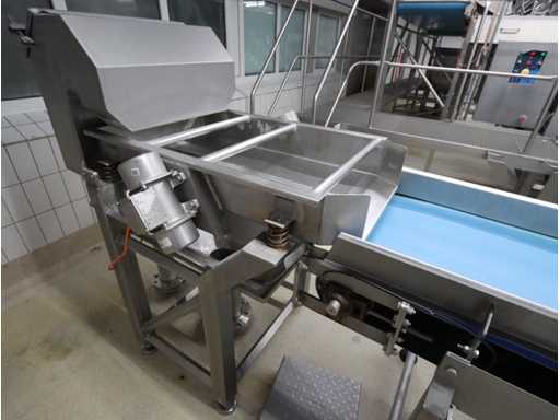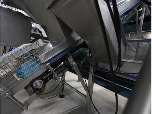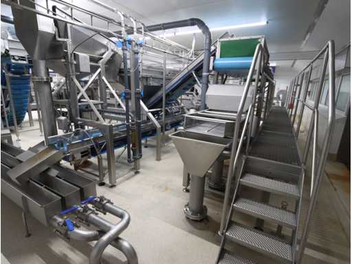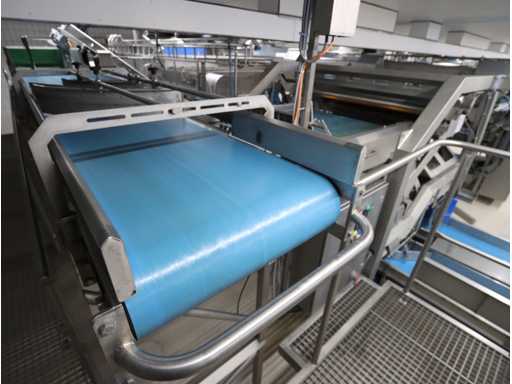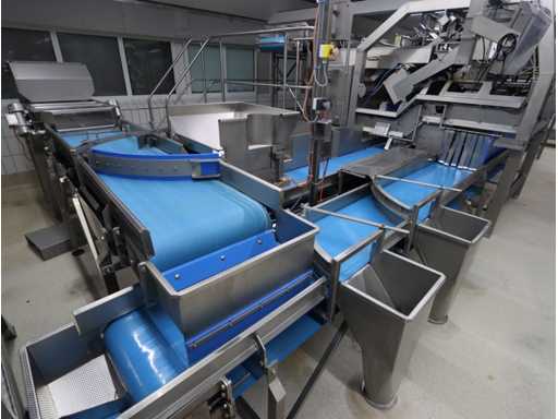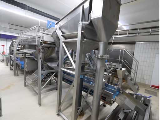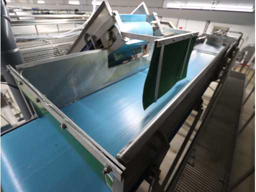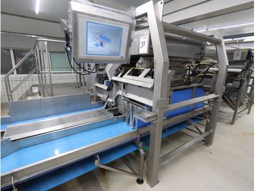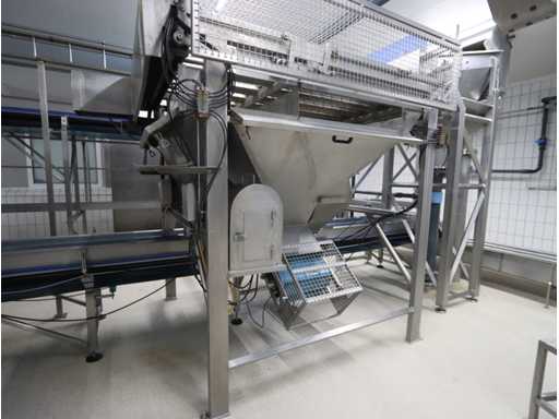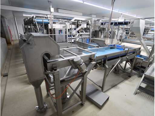 Bestehend aus: "Odenberg" optischer Sortiermaschine mit mechanischem Fingerauswurfsystem, "Tomra"-Touchscreen-Steuerung, Edelstahl-Eingangsbunker mit seitlich/oberem Einführungssystem, unterlaufendem schrägen Förderband, hoch platziertem Einführungsförderband, vollständig ausgestattet mit 2 unterlaufenden Förderbändern und querer Zuführung mit vibrierendem Sieb und Förderband, einschließlich Plattformen mit Lattenboden, insgesamt genutzte Bodenfläche 10500x4750 mm