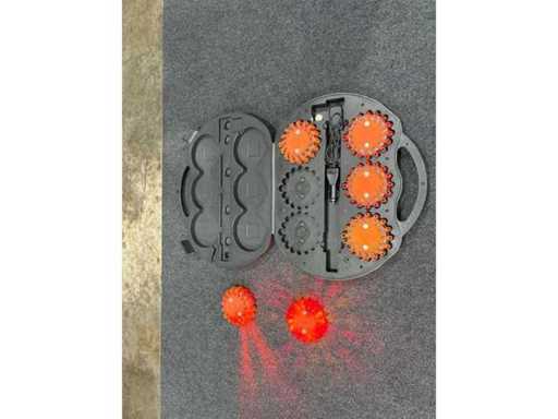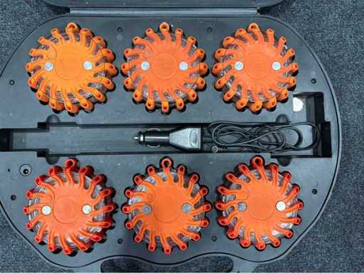 6 wiederaufladbare LED-Warnleuchten in stoßfestem Kunststoffkoffer mit integriertem Ladekabel (12V-Anschluss). Einzelne Leuchten mit Magnethalterung. Volle Funktion sichtbar (mind. 3 aktiv im Testbetrieb).