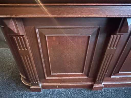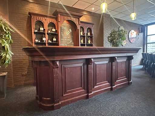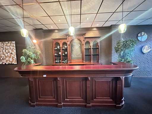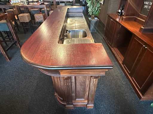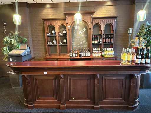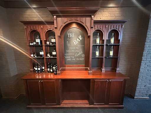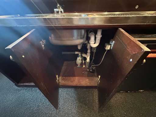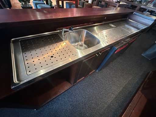 Die Maße dieser Stange betragen 328x90x113 cm (BxDxH). Das Rückengehäuse hat die Maße 268x51x234 cm (BxDxH). Dazu gehören Tropfschalen, Waschbecken und die drei Glas-Pendelleuchten. Abgesehen von den Flaschen in der Bar und den beiden Gamko-Kühlboxen.