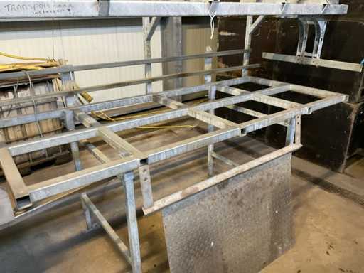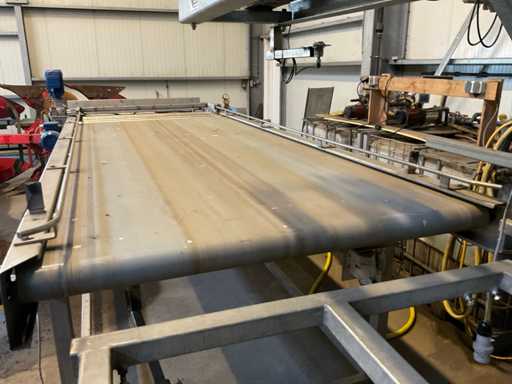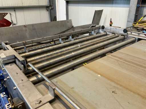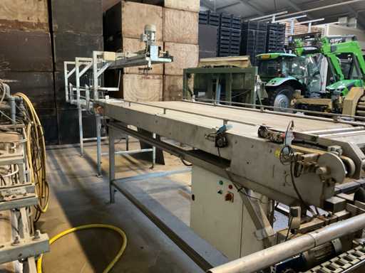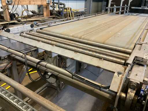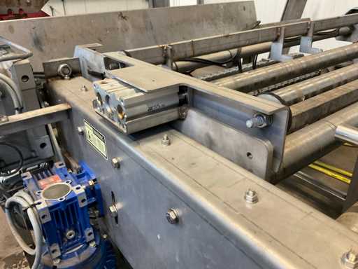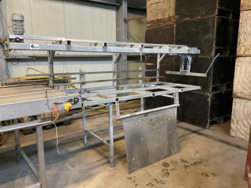 Bestehend aus 3000x1200 Palettenentleerungsrahmen, verzinktem Rahmen, kettengetriebenem Schieber, 3400mm langem Zuführsystem mit pneumatischer Klemme am Ende, die sich ebenfalls um 180 Grad dreht, Kisten werden kopfüber auf das Querförderband gestellt, das sie zu einer möglichen Waschanlage transportiert, Edelstahlrahmen, Gabelstaplerstoppplatte, Vorbereitung für Funkfernbedienung verfügbar