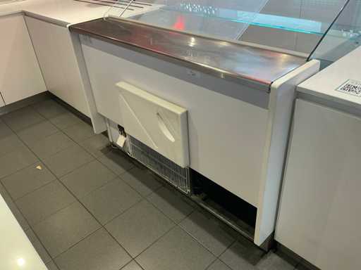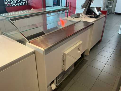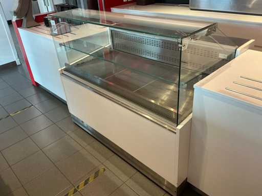 Lüftung 230 V / 1 ph / 50 Hz Vermögen ca. 0,5 – 0,7 kW Temperatur +2 °C bis +8 °C Besturing Mechanisch of digitaal thermostaat (achterzijde) Koelprincipe Geventileerde compressorunit, geïntegreerd Opbouw RVS werkblad + glasopbouw met 2 legplanken Afmetingen ca. 150 cm b × 90 cm h × 75 cm d Front Schuin glas, vaste glasplaat bovenaan Koelmiddel R404A of R290 (afhankelijk van typeplaat)