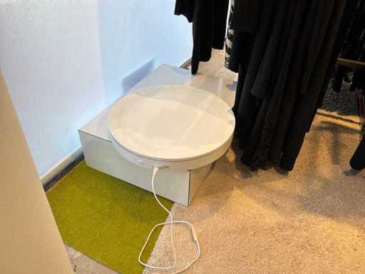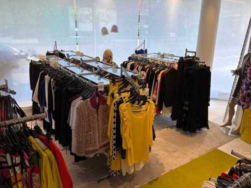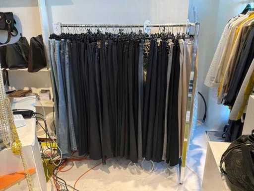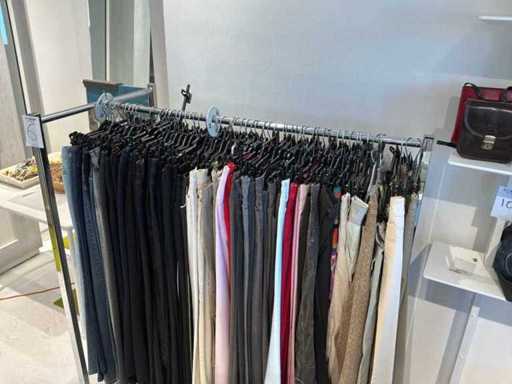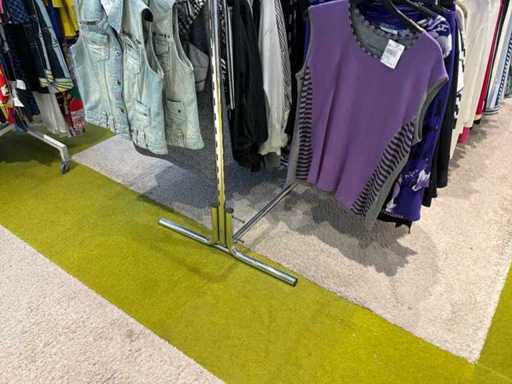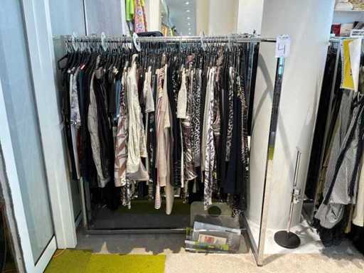 Bestehend aus: 2x Wäscheregal (140x160 cm), 9x Wäscheregal (130x70x145 cm), verschiedenen Verbundkleiderständern (165x90x130 cm), Ausstellungstisch (160x40x70 cm), 3x rotierende Ausstellungsregale. Waren auf den Regalen sind nicht enthalten.