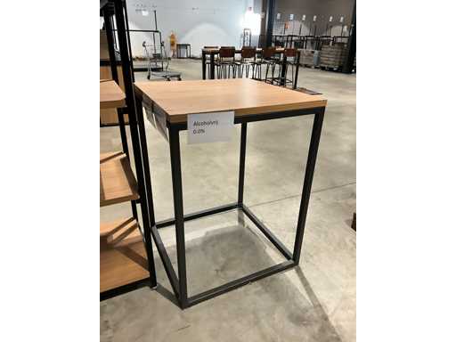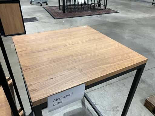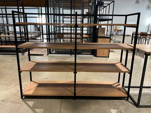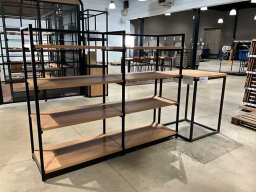 Ausgestattet mit 5 Holzregalen, komplettem Ditto mittel-hohem Regal, Größe: 218x60x172cm, und Bartisch mit Holztisch, Größe: 80x80x110cm,