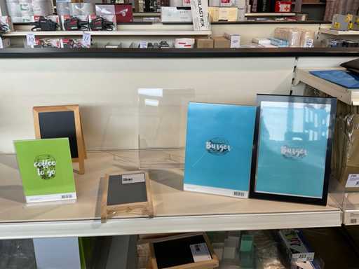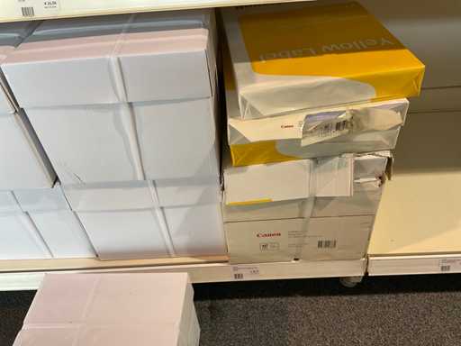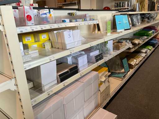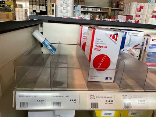 Inhalt von 7 Regalen, bestehend aus Kugelschreibern, Filzstiften, Nahtzangen, Klammern, Preiskarten, Notizblöcken, Kassen, Notizblöcken, Notizblöcken, Kopierpapier und Preisanhängern. Ohne Rack.