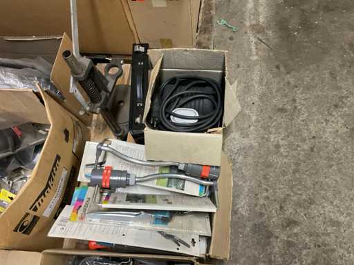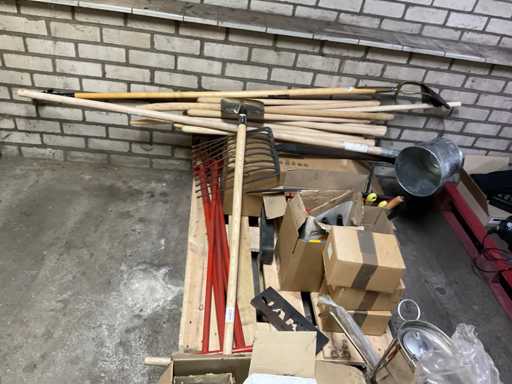 Bestehend aus: Schaufel, Gabel, Eimer, Griffe, Erdbohrer, Drahtschneider, Pestizidsprüher, Sprüher, Luftschlauch, auf 2 Paletten.