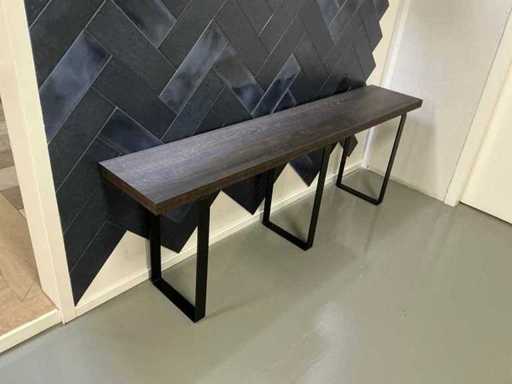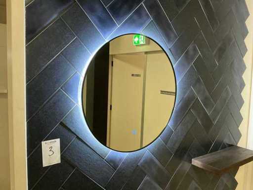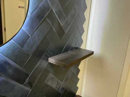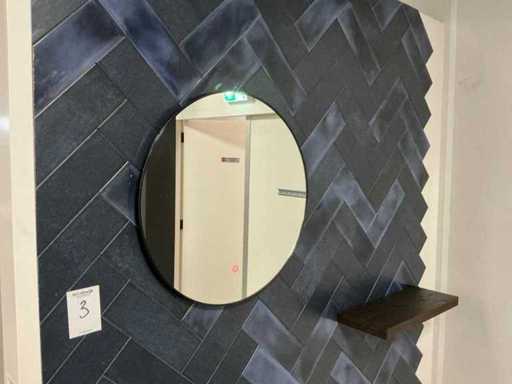 Spiegel Ø60 cm, Bank 150x28x53 cm, Regal 55x20 cm. Holzfarbe S071 decolegno