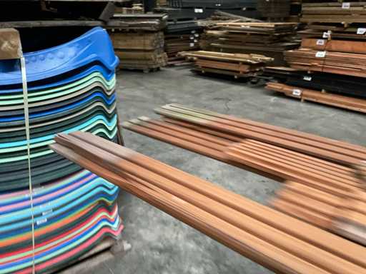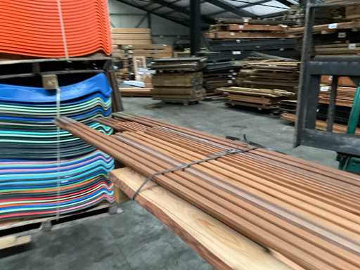 Charge von Western Cedar Dreifach-Rhombusprofil-Platen. Verschiedene Modelle mit Schäden und Verfärbungen. Längste Regale: ca. 500 cm. Siehe Fotos für Details.