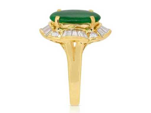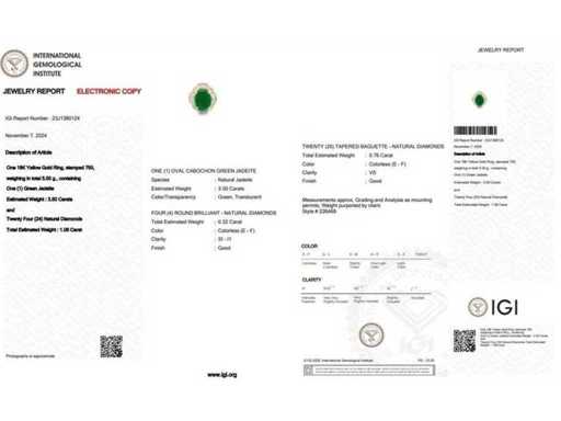 Luxus-Design-Ring Naturgrüner Jade 4,58 Karat in 18 Karat Weißgold mit 5,50 gr mit einem ovalen natürlichen Grünen Jadeide 3,50 Karat und 24 mehrformigen natürlichen Diamanten E-F / VS-SI von 1,08 Karat. Zertifiziert von IGI, einem der weltweit größten unabhängigen Edelstein-Zertifizierungs- und Bewertungsinstitute. Weitere Informationen finden Sie im Zertifikat. Der Schmuck ist in Wirklichkeit besser als die Fotos. Einzelhandelspreis: 12.350 €.