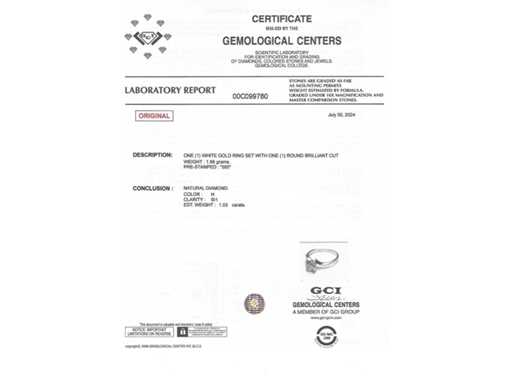 Luxus-Solitärring aus Naturdiamant 1,03 Karat in 14k Weißgold, Gesamtgewicht 1,68 gr. Der zentrale Stein ist ein natürlicher Diamant in rundem Brillant. Es hat sehr gute Farbe und hohe Reinheit H/SI1 mit 1,03 Karat.. Zertifiziert vom GCI Laboratoire, einem der größten internationalen Institute für die Zertifizierung und Bewertung von Diamanten und Edelsteinen. Weitere Informationen finden Sie im Zertifikat. Schmuck ist in Wirklichkeit besser als Fotos. Geschätzter Preis des Händlers: 12.550.-