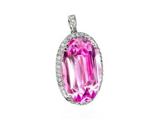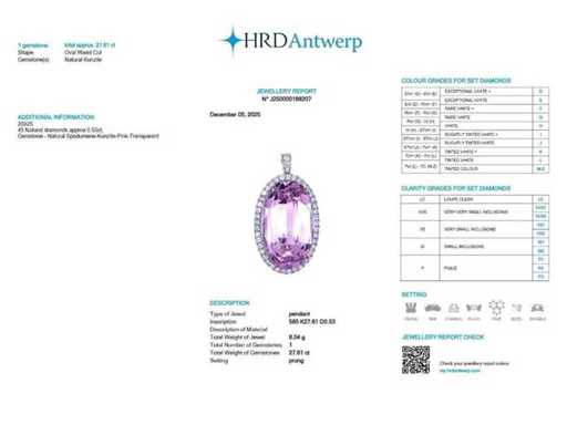 Luxusanhänger Natural Intense Pink Kunzite 28,14 Karat in 14 Karat Weißgold von 8,04 gr mit einem Natural Intense Pink Kunzite im ovalen Schliff von 27,61 Karat und 45 runden brillanten natürlichen Diamanten 0,53 Karat. Zertifiziert von HRD, einem der weltweit größten unabhängigen Edelstein-Zertifizierungs- und Bewertungsinstitute. Weitere Informationen finden Sie im Zertifikat. Der Schmuck ist in Wirklichkeit besser als die Fotos. Einzelhandelspreis: 13.550 €.