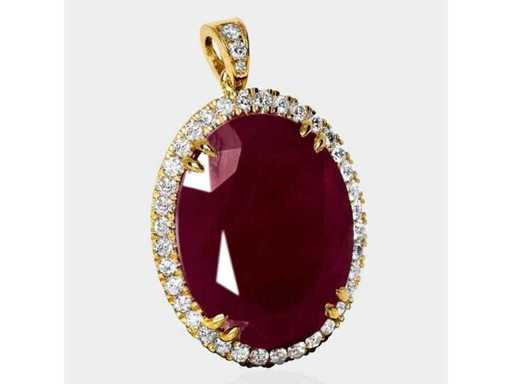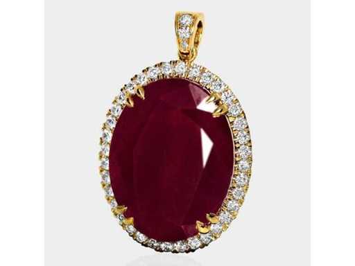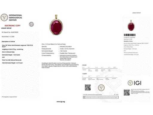 Luxusanhänger Naturpurpurroter Rubin 7,59 Karat in 14 karatfarbenem Gelbgold von 2,79 gr mit einem ovalen roten Rubin von 7,22 Karat und 32 runden brillanten und smaragdförmigen natürlichen Diamanten von 0,37 Karat. Zertifiziert von IGI, einem der weltweit größten unabhängigen Edelstein-Zertifizierungs- und Bewertungsinstitute. Weitere Informationen finden Sie im Zertifikat. Der Schmuck ist in Wirklichkeit besser als die Fotos. Einzelhandelspreis: 10.650 €.