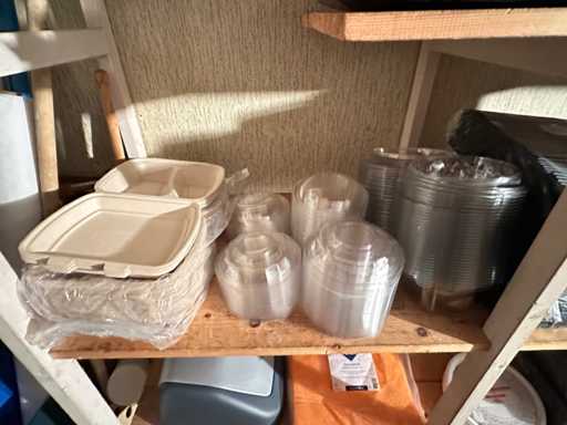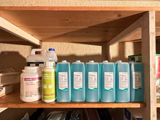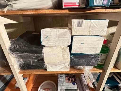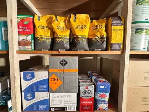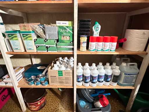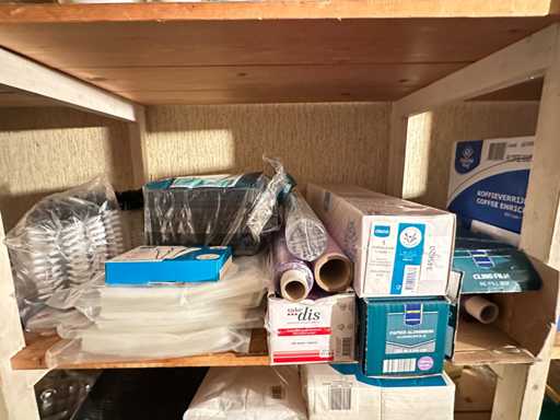 Dieser Inhalt umfasst Reinigungsmittel, Einwegartikel, Kaffee und andere Küchenutensilien.