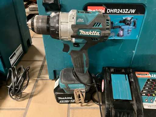 Bestehend aus: Makita DHR243 Akkubohrmaschine mit Makita DX07 Aussaugsystem, 2021 Makita DDF486 Schraubendreher, Makita DC18RC Batterieladegerät und 2x 18V 5,0Ah Batterie