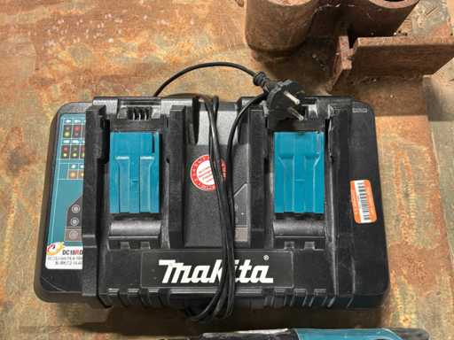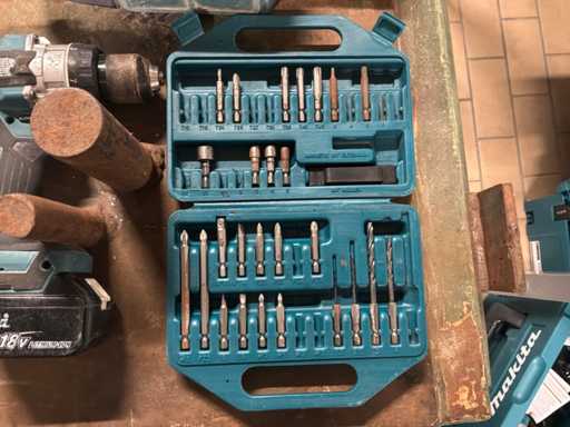 Bestehend aus: Batterie-Hammerbohrer inklusive Staubabsaugung, Batteriebohrer, Batterie-Multitool, zwei 18V-Akkus mit Schnellladegerät und einem Gehäuse mit Bits.