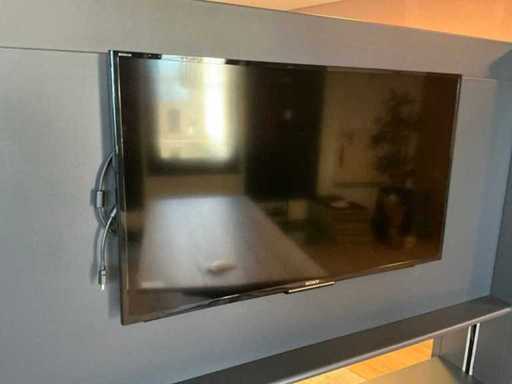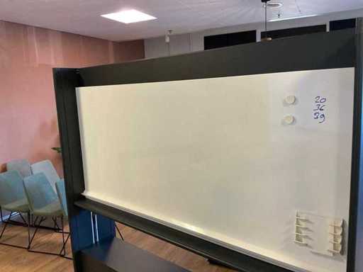 Ausgestattet mit einem Sony Bravia (92x52cm) Fernseher mit Fernbedienung und auf der anderen Seite einem Whiteboard mit zwei Schränken.